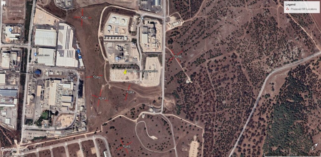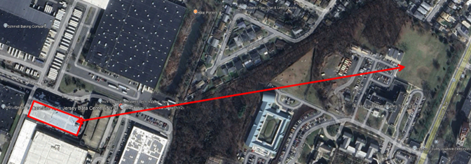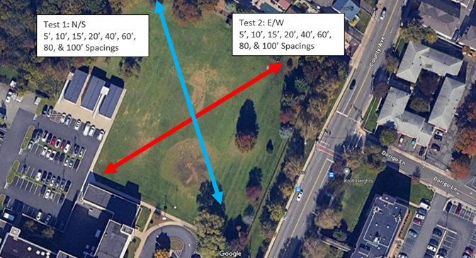 An existing data center planned a new building next door in place of an existing parking lot, and the electric utility required soil resistivity measurements. The closest suitable area for measurements (red arrow) was ½ mile away – not ideal, but the best that the site location and conditions would allow. Testing site access can have unique circumstances. In this case, the owner of the testing site, a mental health facility, had patient safety concerns regarding the injected current on their property. After careful explanation of our testing process, we were granted access. Be prepared to explain to a site owner what you are doing, especially when accessing private property.